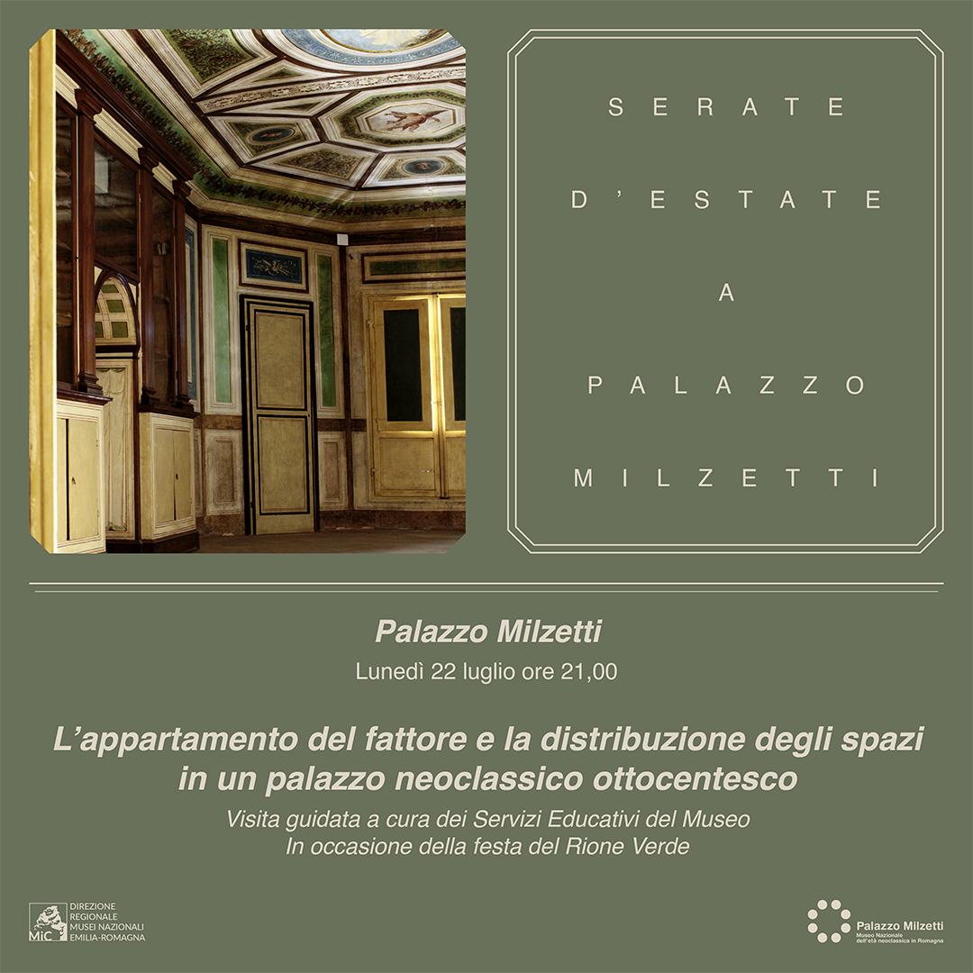 Lunedì 22 luglio SERATE D’ESTATE A PALAZZO MILZETTI Apertura straordinaria 19.00-23.00 Ore 21.00 L’appartamento del fattore e la distribuzione degli spazi in un palazzo neoclassico ottocentesco Visita guidata a cura dei Servizi Educativi del Museo Palazzo Milzetti viene ristrutturato tra fine Settecento e inizio Ottocento secondo idee innovative di distribuzione e utilizzo degli spazi che […] |